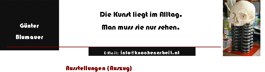 2014Internationale Kunstmesse ART INNSBRUCK auf Einladung der Galerie Mainart/CH2013TAGE DER OFFENEN ATELIERS NÖ, Atelier Traisen/NÖTRAISEN4EVER in Zusammenarbeit mit Mag. Marianne Plaimer, Pablo Deinsbergerund Karl MayerhoferSKULPTURENAUSSTELLUNG GALERIE M, Kirchstetten/NÖ2012„Νεκρά τέχνης“,Abbruchhaus Traisen/NÖP3 TV-SENDUNG, Abbruchhaus Traisen/NÖKUNST-KULTURFESTIVAL Schlosspark Mamling/OÖPETING IST KNOCHENARBEIT in Zusammenarbeit mit Leo Haz,Artellerie White Cuba, Braunau/OÖORF-SENDUNG, Rosenhügelstudios Wien2011OPERA OS, Kunsthalle St. Pölten/NÖKUNST UND DESIGN, Abbruchhaus Traisen/NÖMAKESOMETHING in Zusammenarbeit mit Mag. Marianne Plaimer und der mobilen Jugendarbeit Südrand, Abbruchhaus Traisen/NÖKUNST TRIFFT MODE in Zusammenarbeit mit Magdalena AmberKNOCHENARBEIT, Abbruchhaus Traisen/NÖ |