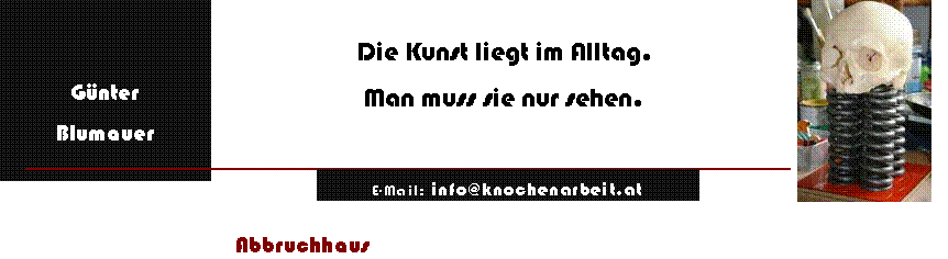 Das hundert Jahre alte Haus, welches zum Abriss vorgesehen war ist 2010 großzügiger Weise von der Gemeinde Traisen in Niederösterreich als Ort der Begegnung zur Verfügung gestellt worden.Die Räumlichkeiten wurden in Eigenregie zum öffentlichen Atelier und einer Galerie umgestaltet.„Knochenarbeit“ im wahrsten Sinne des Wortes.Die Abschlussveranstaltung fand im August 2013 statt.Das Abbruchhaus musste einer Durchfahrt zu einem Parkplatz weichen und wurde im November 2013 endgültig geschliffen.„Memento mori“-Gedenke des Todes, alles ist vergänglich. (28.11.2013) |